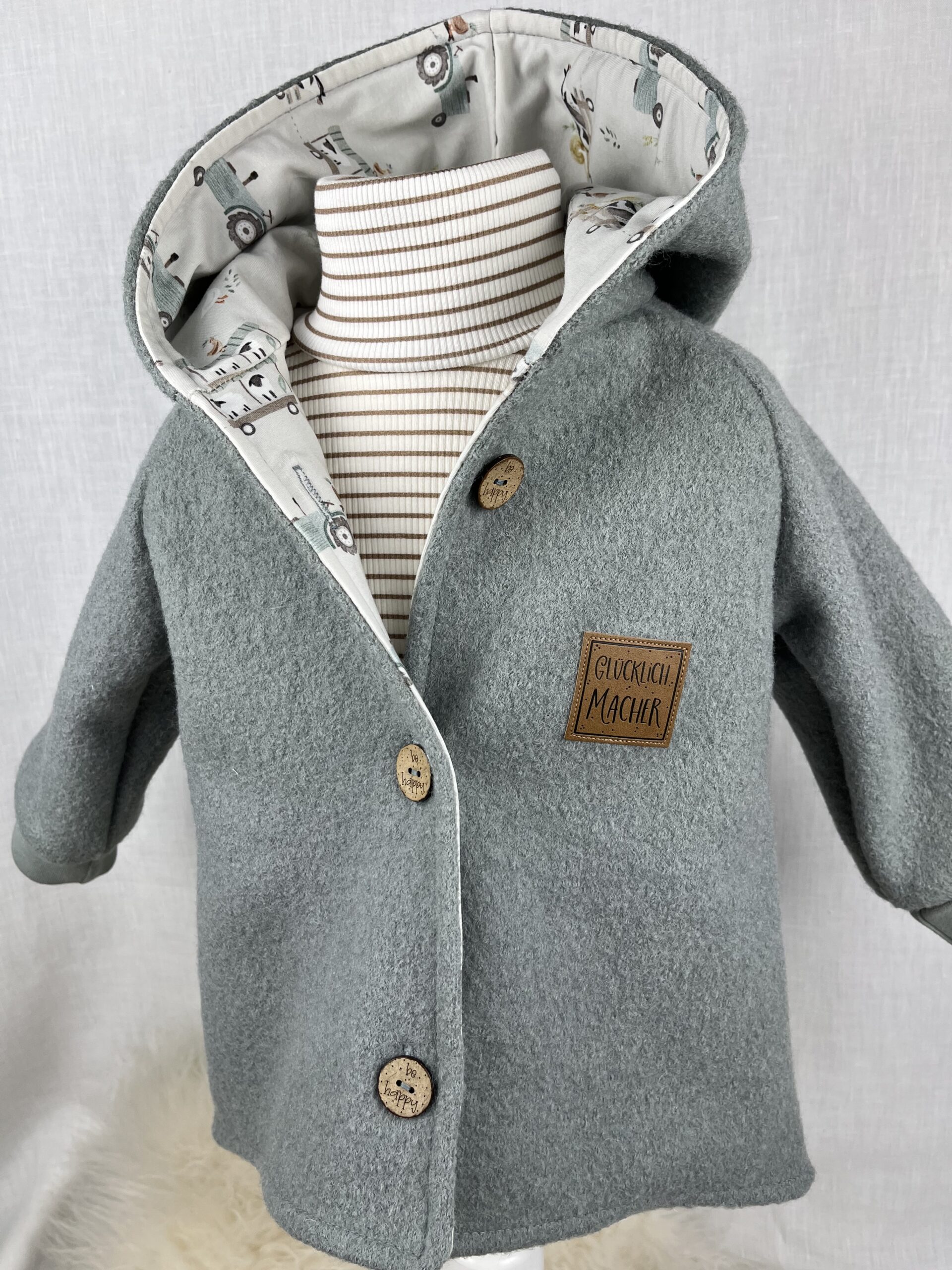 WollWALK «WALK-Jacke – Altmint mit Bauernhof Traktor» Grösse 92