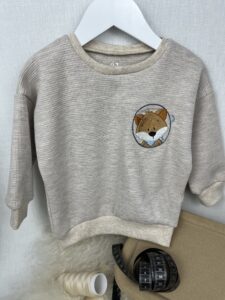 Kleider «Sweater – Waffelstrick Jersey Beige meliert – gestickter Fuchs mit Halstuch» Grösse 92
